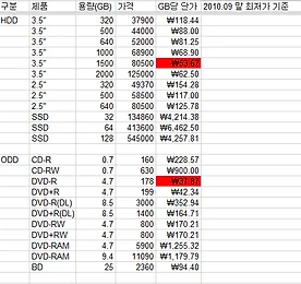 HDD 썸네일형 리스트형 백업용 미디어 단가 비교해보니.. 작년포스트에 이어 최근의 단가상황을 다시 비교해보니 아래와 같다. 전체적으로 가격이 작년 9월에 비해 많이 떨어진걸 알수 있다. 한가지 특이한점은 작년기준으로는 백업을 HDD에 하는게 편의성이나 여러모로 유리하였다면 지금은 BD를 이용하는 방법도 고려해볼만 하다. 단 BD WRITER 의 가격이 다소 고가인 점을 제외하고.. 구분 제품 용량(GB) 가격 2010.09 말 최저가 기준 GB당 단가 가격 2011.03 중 최저가 기준 GB당 단가 HDD 3.5" 320 37900 ₩118.44 38000 ₩118.75 3.5" 500 44000 ₩88.00 39800 ₩79.60 3.5" 640 52000 ₩81.25 54500 ₩85.16 3.5" 1000 68900 ₩68.90 56350 ₩56.35 3.. 더보기 백업용 미디어 단가 비교해보니 차라리 HDD를 쓰자 문득 데이터 백업용 미디어 HDD, ODD 의 용량별 단가를 보니 HDD 는 1.5T 가 용량대비 가격이 제일 싸고 ODD는 4.7G DVD-R 이 용량대비 가격이 제일 싸다. ODD는 특성상 한번 저장후 재사용이 불가하지만 HDD 는 재사용(쓰고/지우고) 가 얼마든지 가능하다. 장점은 53원 대 37원으로 조금 비싸긴 하지만 재사용의 편이성과 데이터관리가 무척 용이한점이 겠고 최악의 단점은 충격에 무지무지 약해서 ㄷㄷㄷ 하면서 보관을 잘해야한다. 참고로 ODD 는 배속이나 여타 조건은 무시하고 그냥 용량대비 최저가로 골랐다. 배속에 따라 가격이 다를수 있으니 참고자료로만 활용.. [결론] 백업은 편하게 하드로 하고 보관을 잘하자. 더보기 이전 1 다음